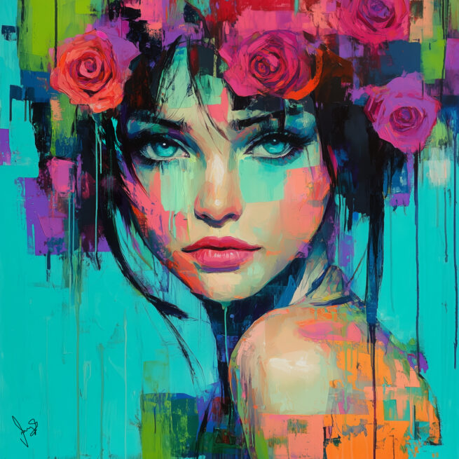 Flowergirl, Mixed Media auf Leinen/Holz/Epoxy, 100 x 100 cm