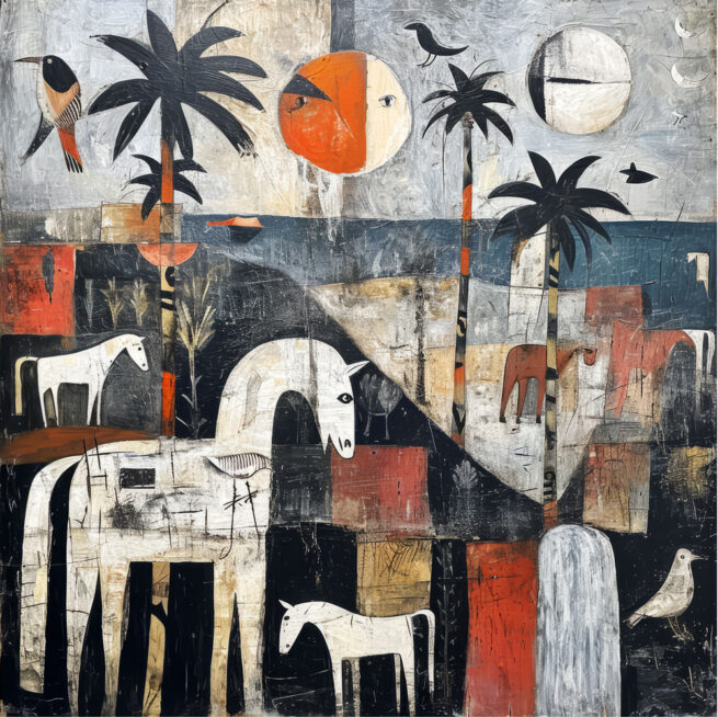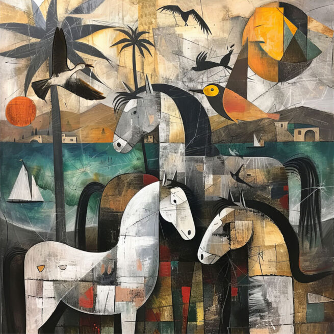 Horses on the Beach 2, Mixed Media auf Leinen/Holz/Epoxy, 100 x 100 cm