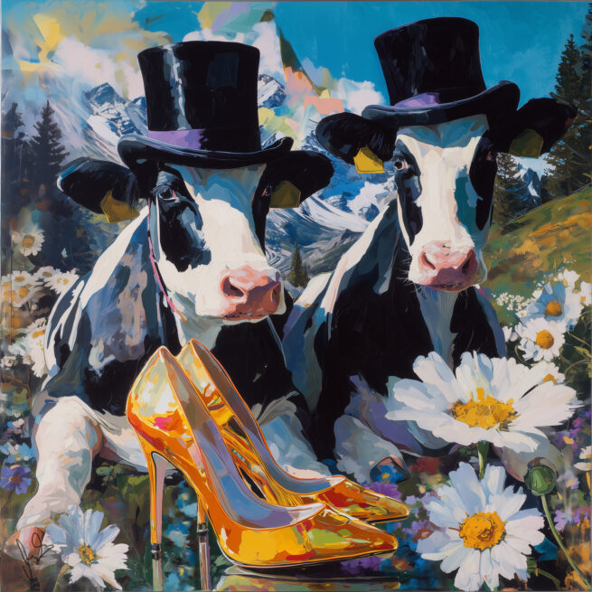 Kuh, Mixed Media auf Leinen/Holz/Epoxy. 100 x 100 cm